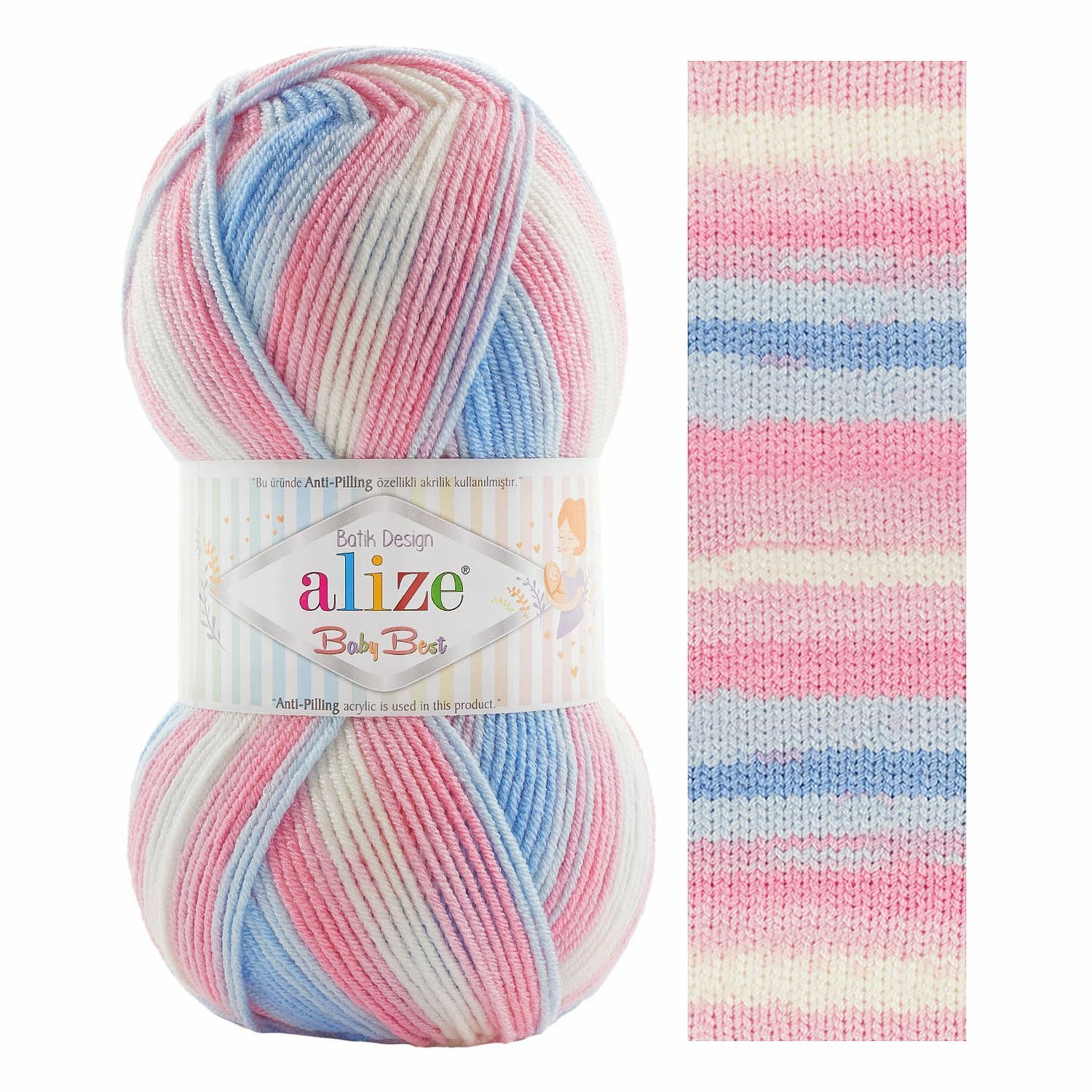 Ализе Беби бест батик окрашена секциями, в готовом полотне получается красивая размытая волна в «технике батика». Вяжется очень просто, а значит, вязать вещи из пряжи Ализе Беби бест сможет даже начинающая вязальщица.