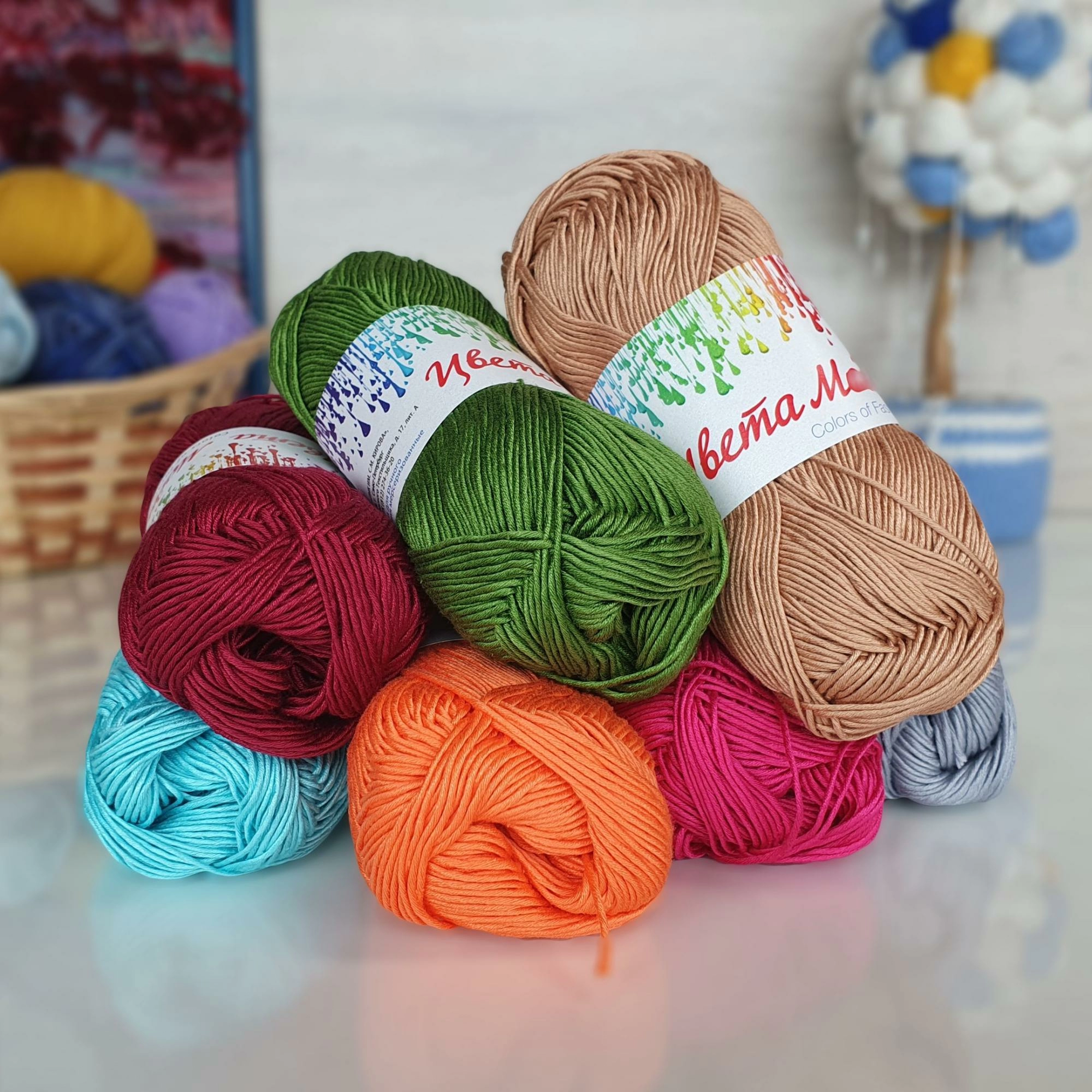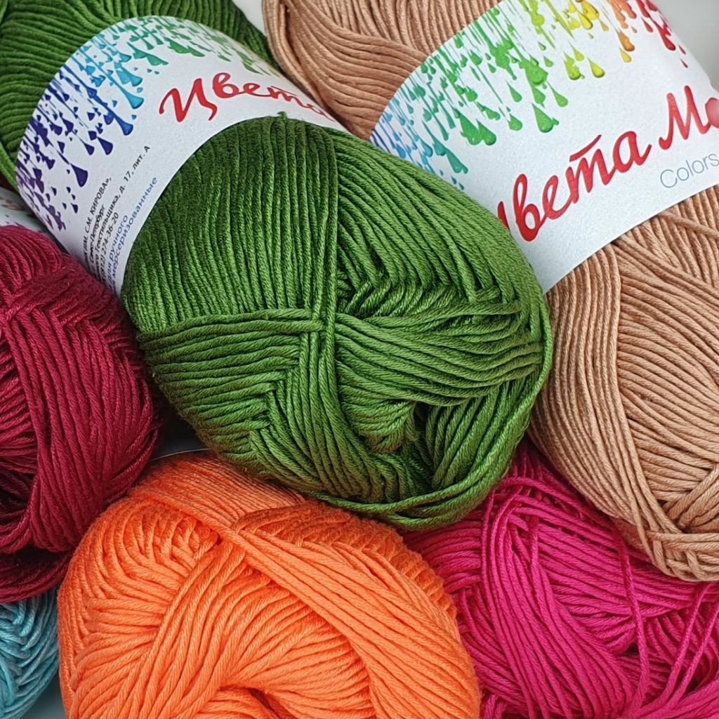 Пряжа (нитки) для вязания «Цвета моды»: Состав 100% мерсеризованный хлопок, моток 75 г, 190 м, в упаковке 4 мотка.